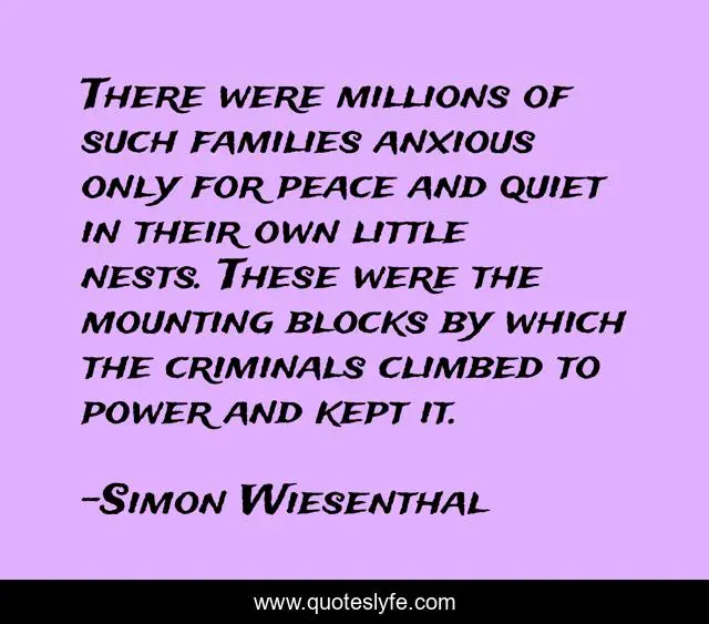 This page presents the quote "There were millions of such families anxious only for peace and quiet in their own little nests. These were the mounting blocks by which the criminals climbed to power and kept it.". Author of this quote is Simon Wiesenthal. This quote is about peace-in-society, peace-on-earth, peace, community, fighting-against-injustice, creating-strong-communities, doing-whats-right, standing-up, dissolving-injustice,.