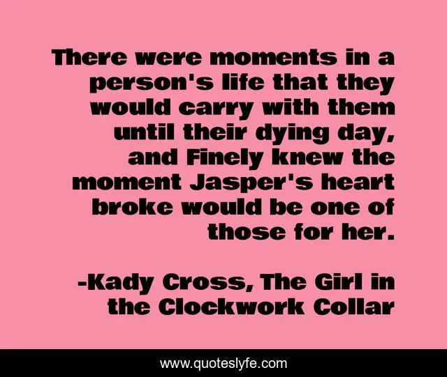 This page presents the quote "There were moments in a person's life that they would carry with them until their dying day, and Finely knew the moment Jasper's heart broke would be one of those for her.". Author of this quote is Kady Cross, The Girl in the Clockwork Collar. This quote is about moments, heart-break, jasper-renn, finely-jayne,.