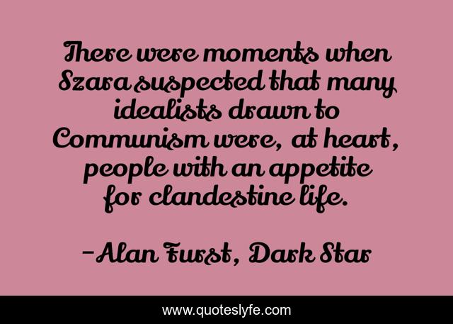 This page presents the quote "There were moments when Szara suspected that many idealists drawn to Communism were, at heart, people with an appetite for clandestine life.". Author of this quote is Alan Furst, Dark Star. This quote is about communism, espionage,.