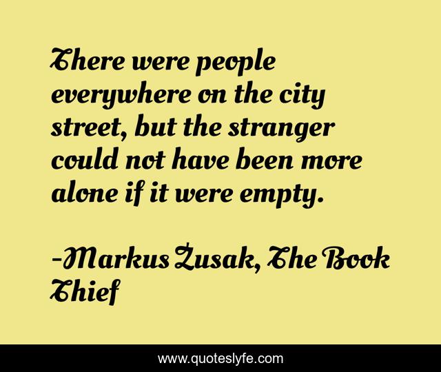 This page presents the quote "There were people everywhere on the city street, but the stranger could not have been more alone if it were empty.". Author of this quote is Markus Zusak, The Book Thief. This quote is about lonely, the-last-human-stranger,.