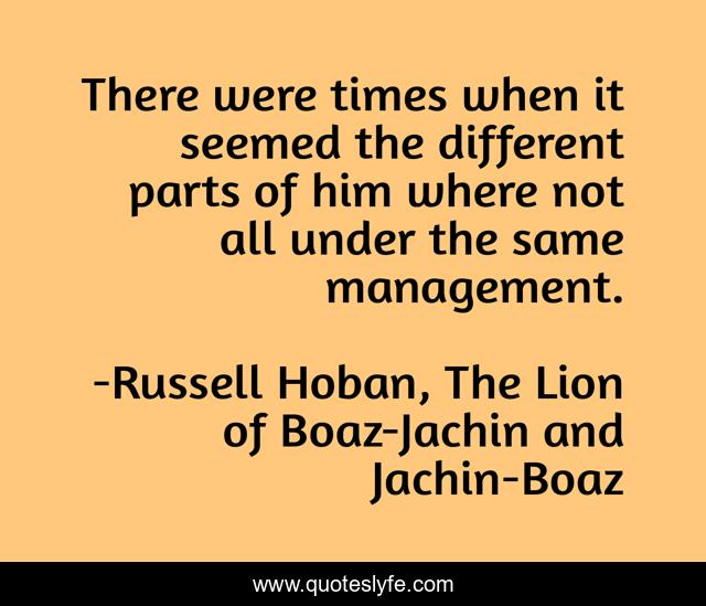 This page presents the quote "There were times when it seemed the different parts of him where not all under the same management.". Author of this quote is Russell Hoban, The Lion of Boaz-Jachin and Jachin-Boaz. .