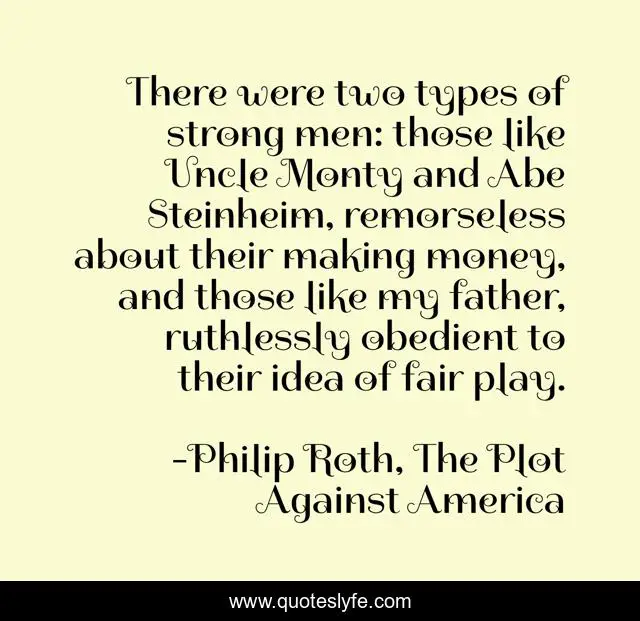 This page presents the quote "There were two types of strong men: those like Uncle Monty and Abe Steinheim, remorseless about their making money, and those like my father, ruthlessly obedient to their idea of fair play.". Author of this quote is Philip Roth, The Plot Against America. This quote is about fair-play, father, human-nature,.