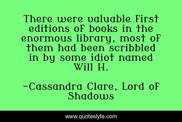This page presents the quote "There were valuable first editions of books in the enormous library, most of them had been scribbled in by some idiot named Will H.". Author of this quote is Cassandra Clare, Lord of Shadows. This quote is about first-editions, kit-herondale, books, will-herondale,.