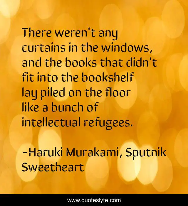 This page presents the quote "There weren't any curtains in the windows, and the books that didn't fit into the bookshelf lay piled on the floor like a bunch of intellectual refugees.". Author of this quote is Haruki Murakami, Sputnik Sweetheart. .