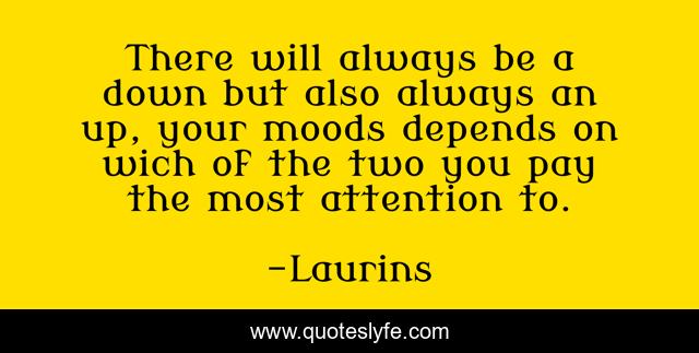 This page presents the quote "There will always be a down but also always an up, your moods depends on wich of the two you pay the most attention to.". Author of this quote is Laurins. This quote is about life, love, up, down, depressive, live-in-the-moment, affection, happy,.