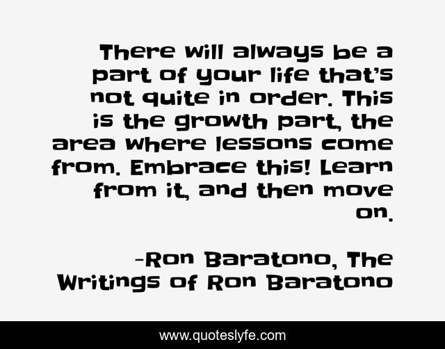 This page presents the quote "There will always be a part of your life that’s not quite in order. This is the growth part, the area where lessons come from. Embrace this! Learn from it, and then move on.". Author of this quote is Ron Baratono, The Writings of Ron Baratono. This quote is about life, growth, embrace-life, learning,.