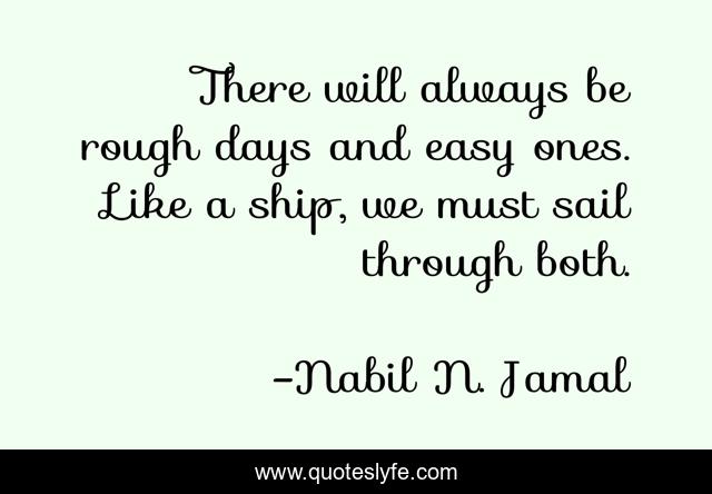 This page presents the quote "There will always be rough days and easy ones. Like a ship, we must sail through both.". Author of this quote is Nabil N. Jamal. This quote is about both, nabil-n-jamal, success, perseverance, jamal, always, sail, days, patience,.