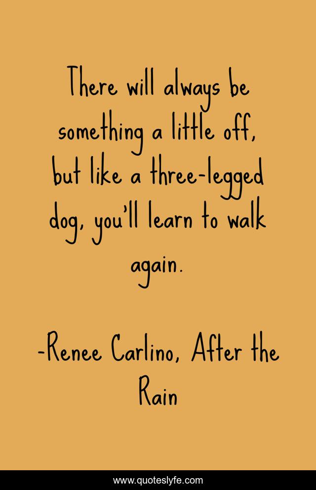 This page presents the quote "There will always be something a little off, but like a three-legged dog, you’ll learn to walk again.". Author of this quote is Renee Carlino, After the Rain. .