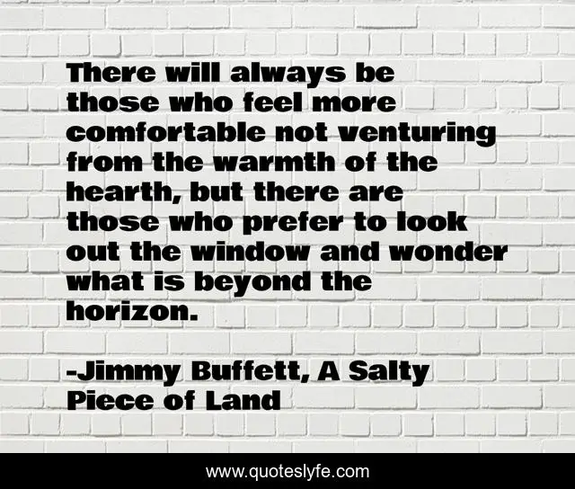 This page presents the quote "There will always be those who feel more comfortable not venturing from the warmth of the hearth, but there are those who prefer to look out the window and wonder what is beyond the horizon.". Author of this quote is Jimmy Buffett, A Salty Piece of Land. This quote is about enthusiasm, adventure, inspirational,.