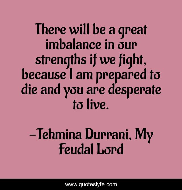 This page presents the quote "There will be a great imbalance in our strengths if we fight, because I am prepared to die and you are desperate to live.". Author of this quote is Tehmina Durrani, My Feudal Lord. This quote is about life, strength, die, fight, live, death, desperate,.