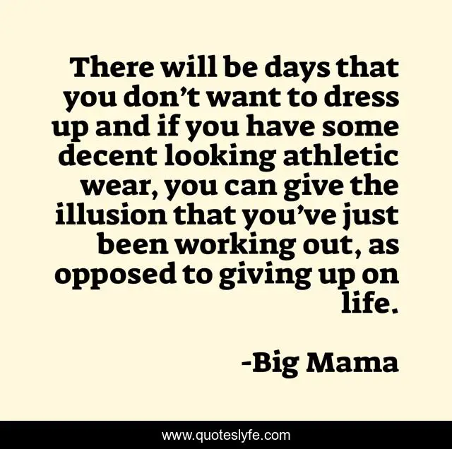 This page presents the quote "There will be days that you don’t want to dress up and if you have some decent looking athletic wear, you can give the illusion that you’ve just been working out, as opposed to giving up on life.". Author of this quote is Big Mama. This quote is about fashion, humor, thebigmamablog,.