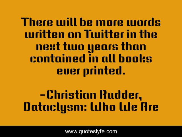 This page presents the quote "There will be more words written on Twitter in the next two years than contained in all books ever printed.". Author of this quote is Christian Rudder, Dataclysm: Who We Are. This quote is about twitter, books, printed, words, written,.