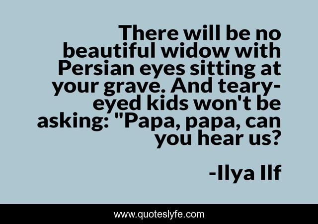 This page presents the quote "There will be no beautiful widow with Persian eyes sitting at your grave. And teary-eyed kids won't be asking: "Papa, papa, can you hear us?". Author of this quote is Ilya Ilf. This quote is about ilf, golden-calf, petrov, ostap, bender, death-and-dying,.