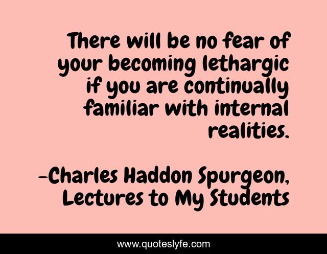 This page presents the quote "There will be no fear of your becoming lethargic if you are continually familiar with internal realities.". Author of this quote is Charles Haddon Spurgeon, Lectures to My Students. This quote is about discipleship, leadership, what-a-vacation,.