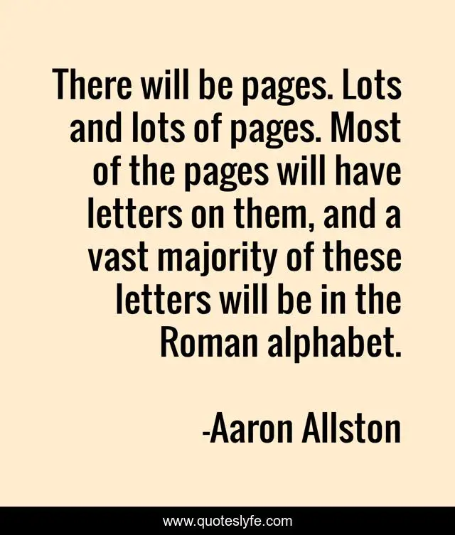 This page presents the quote "There will be pages. Lots and lots of pages. Most of the pages will have letters on them, and a vast majority of these letters will be in the Roman alphabet.". Author of this quote is Aaron Allston. This quote is about writing-craft, writing,.