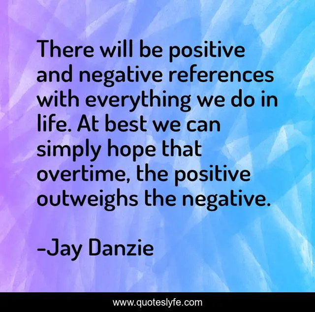 This page presents the quote "There will be positive and negative references with everything we do in life. At best we can simply hope that overtime, the positive outweighs the negative.". Author of this quote is Jay Danzie. This quote is about positive, confidence, motivational, optimistic, inspiration,.