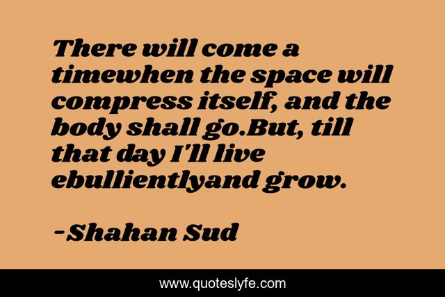 This page presents the quote "There will come a timewhen the space will compress itself, and the body shall go.But, till that day I'll live ebullientlyand grow.". Author of this quote is Shahan Sud. .