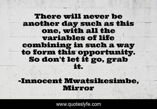 This page presents the quote "There will never be another day such as this one, with all the variables of life combining in such a way to form this opportunity. So don't let it go, grab it.". Author of this quote is Innocent Mwatsikesimbe, Mirror. This quote is about chance, opportunity, life, time,.