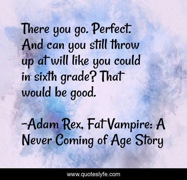 This page presents the quote "There you go. Perfect. And can you still throw up at will like you could in sixth grade? That would be good.". Author of this quote is Adam Rex, Fat Vampire: A Never Coming of Age Story. This quote is about funny, comedy, gross,.