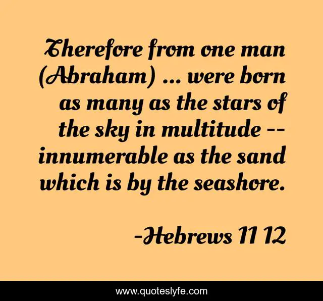 This page presents the quote "Therefore from one man (Abraham) ... were born as many as the stars of the sky in multitude -- innumerable as the sand which is by the seashore.". Author of this quote is Hebrews 11 12. This quote is about bible, scripture, inspirational-religious,.