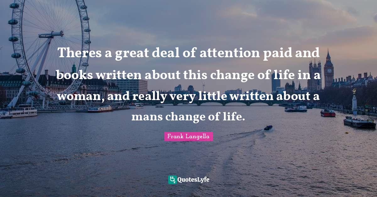 This page presents the quote "Theres a great deal of attention paid and books written about this change of life in a woman, and really very little written about a mans change of life.". Author of this quote is Frank Langella. This quote is about life, attention, paid, life changing, written, change, book,.