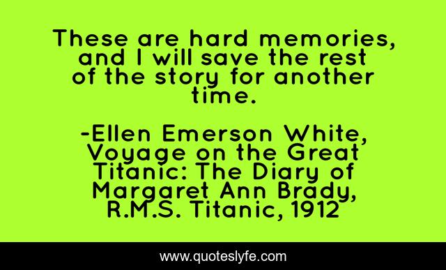 This page presents the quote "These are hard memories, and I will save the rest of the story for another time.". Author of this quote is Ellen Emerson White, Voyage on the Great Titanic: The Diary of Margaret Ann Brady, R.M.S. Titanic, 1912. This quote is about memories, titanic,.