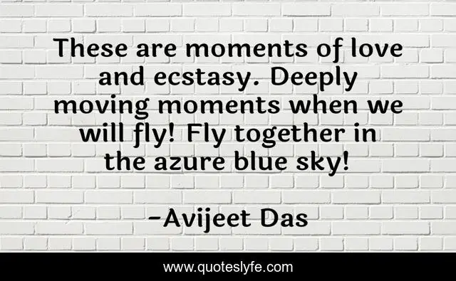 This page presents the quote "These are moments of love and ecstasy. Deeply moving moments when we will fly! Fly together in the azure blue sky!". Author of this quote is Avijeet Das. This quote is about fly, love, meaning-of-life-is-each-other, moments, sky, muse, ecstasy-of-life, flying-spirit, moments-of-life,.