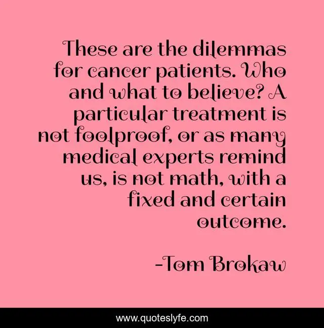 This page presents the quote "These are the dilemmas for cancer patients. Who and what to believe? A particular treatment is not foolproof, or as many medical experts remind us, is not math, with a fixed and certain outcome.". Author of this quote is Tom Brokaw. This quote is about cancer-fighter, cancer,.