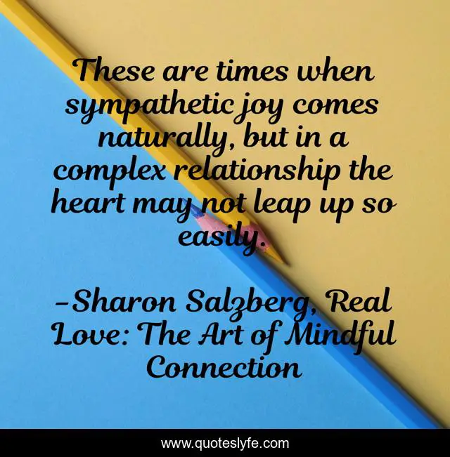 This page presents the quote "These are times when sympathetic joy comes naturally, but in a complex relationship the heart may not leap up so easily.". Author of this quote is Sharon Salzberg, Real Love: The Art of Mindful Connection. This quote is about heart, love, relationship, sympathetic-joy, real-love, affection,.