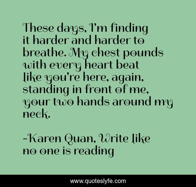This page presents the quote "These days, I'm finding it harder and harder to breathe. My chest pounds with every heart beat like you're here, again, standing in front of me, your two hands around my neck.". Author of this quote is Karen Quan, Write like no one is reading. This quote is about breathe, love, relationship, heart-beat, abstract, fatal-attraction, broken, you-and-me, affection,.