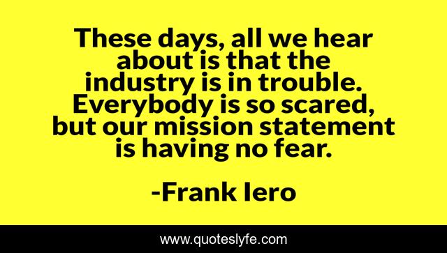 This page presents the quote "These days, all we hear about is that the industry is in trouble. Everybody is so scared, but our mission statement is having no fear.". Author of this quote is Frank Iero. This quote is about no fear, mission, scared,.