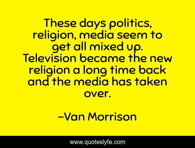 This page presents the quote "These days politics, religion, media seem to get all mixed up. Television became the new religion a long time back and the media has taken over.". Author of this quote is Van Morrison. This quote is about politics, time, media,.