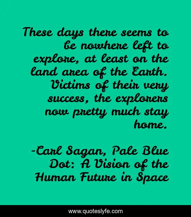 This page presents the quote "These days there seems to be nowhere left to explore, at least on the land area of the Earth. Victims of their very success, the explorers now pretty much stay home.". Author of this quote is Carl Sagan, Pale Blue Dot: A Vision of the Human Future in Space. This quote is about earth, exploration, science,.