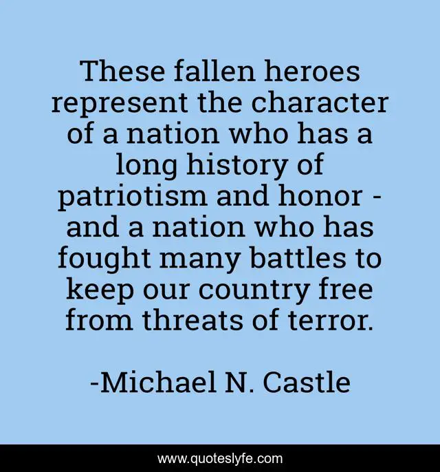 This page presents the quote "These fallen heroes represent the character of a nation who has a long history of patriotism and honor - and a nation who has fought many battles to keep our country free from threats of terror.". Author of this quote is Michael N. Castle. This quote is about patriotism, character, honor,.