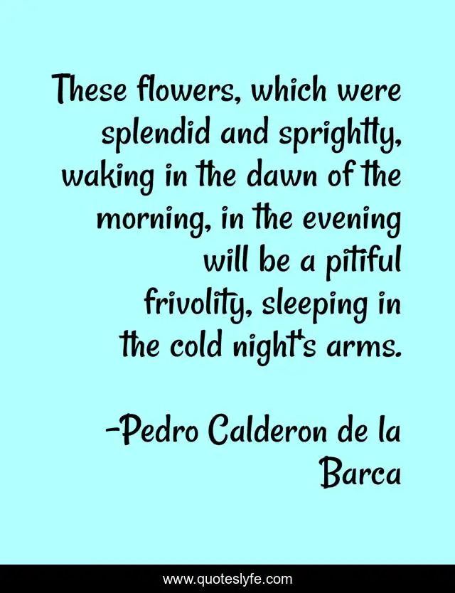 This page presents the quote "These flowers, which were splendid and sprightly, waking in the dawn of the morning, in the evening will be a pitiful frivolity, sleeping in the cold night's arms.". Author of this quote is Pedro Calderon de la Barca. This quote is about flowers, morning, night,.