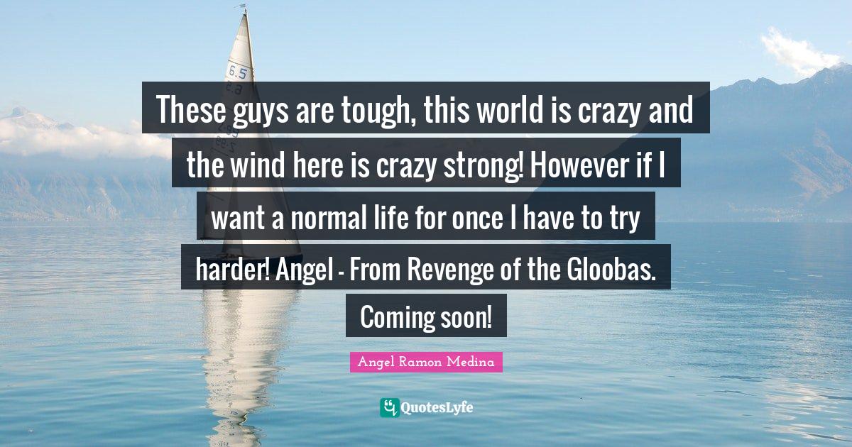 This page presents the quote "These guys are tough, this world is crazy and the wind here is crazy strong! However if I want a normal life for once I have to try harder! Angel - From Revenge of the Gloobas. Coming soon!". Author of this quote is Angel Ramon Medina. This quote is about enthusiasm, inspirational, major-book, science-fiction, never-give-up-on-yourself,.