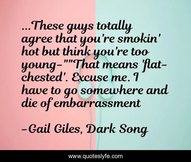 This page presents the quote "...These guys totally agree that you're smokin' hot but think you're too young-""That means 'flat-chested'. Excuse me. I have to go somewhere and die of embarrassment". Author of this quote is Gail Giles, Dark Song. This quote is about ya, ames, dark-song, gail-giles, marc,.