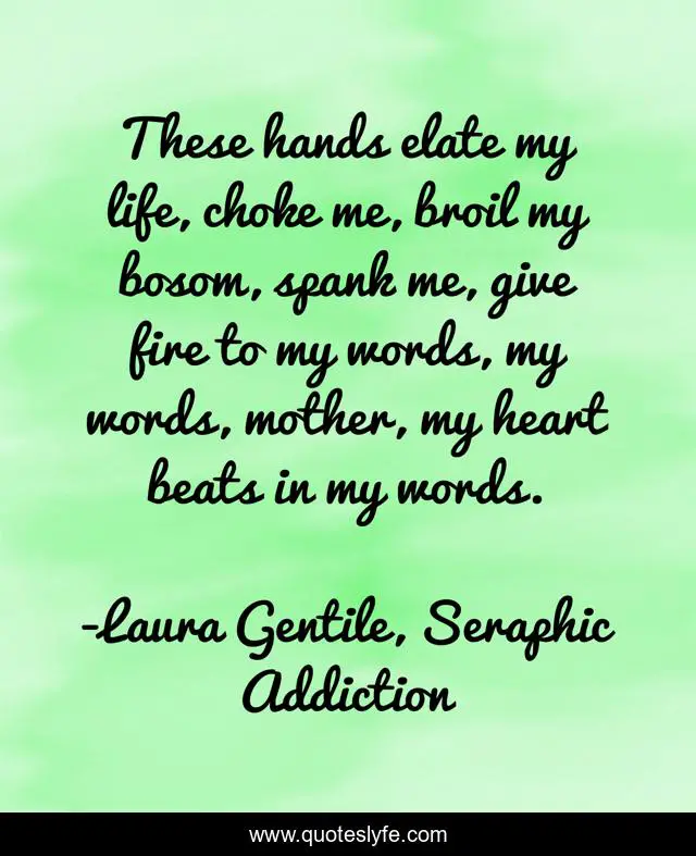 This page presents the quote "These hands elate my life, choke me, broil my bosom, spank me, give fire to my words, my words, mother, my heart beats in my words.". Author of this quote is Laura Gentile, Seraphic Addiction. This quote is about heart, life, fire, bosom, words, hands,.