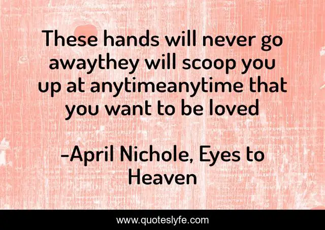This page presents the quote "These hands will never go awaythey will scoop you up at anytimeanytime that you want to be loved". Author of this quote is April Nichole, Eyes to Heaven. This quote is about faith, religious, poetry,.