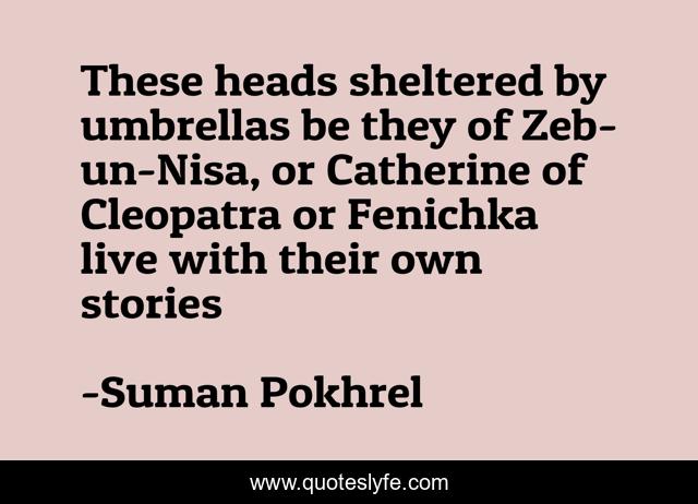 This page presents the quote "These heads sheltered by umbrellas be they of Zeb-un-Nisa, or Catherine of Cleopatra or Fenichka live with their own stories". Author of this quote is Suman Pokhrel. This quote is about catherine, cleopatra, equality, zeb-un-nisa, fenichka,.
