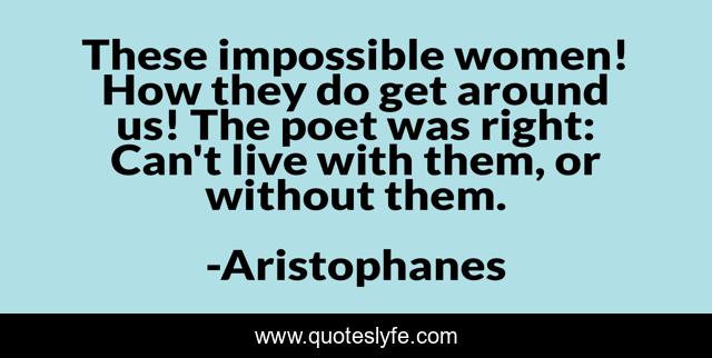 This page presents the quote "These impossible women! How they do get around us! The poet was right: Can't live with them, or without them.". Author of this quote is Aristophanes. This quote is about impossible, live, right,.