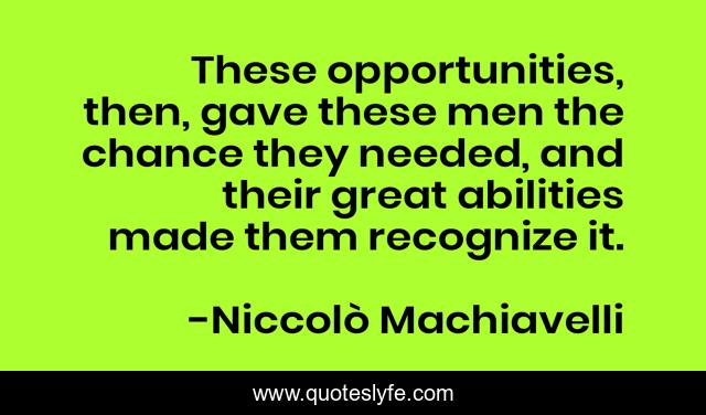 This page presents the quote "These opportunities, then, gave these men the chance they needed, and their great abilities made them recognize it.". Author of this quote is Niccolò Machiavelli. This quote is about politics, moses, machiavelli, the-prince,.