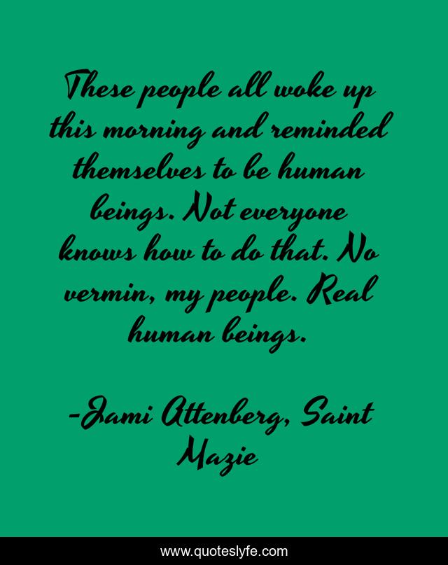 This page presents the quote "These people all woke up this morning and reminded themselves to be human beings. Not everyone knows how to do that. No vermin, my people. Real human beings.". Author of this quote is Jami Attenberg, Saint Mazie. This quote is about kindness, human,.