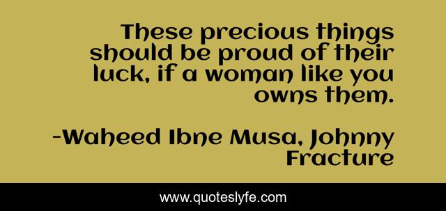 This page presents the quote "These precious things should be proud of their luck, if a woman like you owns them.". Author of this quote is Waheed Ibne Musa, Johnny Fracture. .