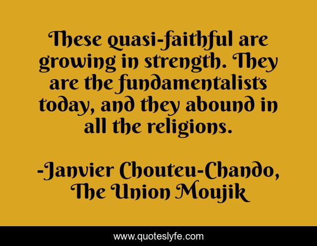 This page presents the quote "These quasi-faithful are growing in strength. They are the fundamentalists today, and they abound in all the religions.". Author of this quote is Janvier Chouteu-Chando, The Union Moujik. This quote is about faith, religion, fundamentalism, inspirational, terror, enthusiasm, terrorism,.