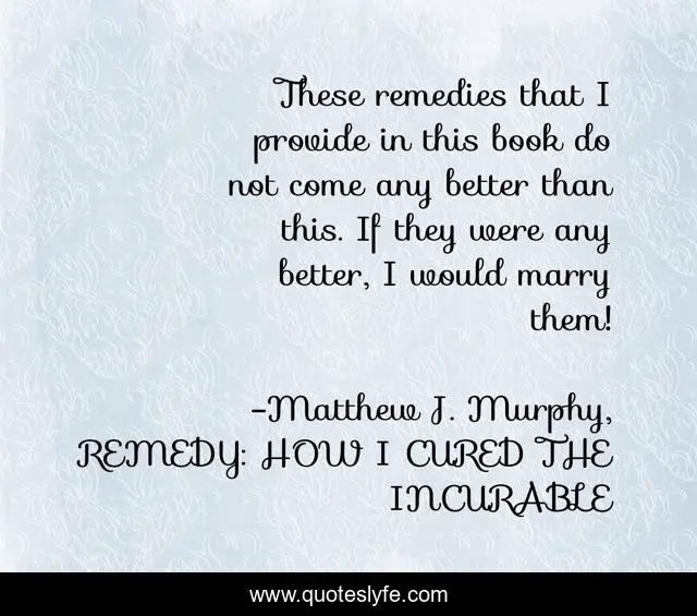 "Matthew J. Murphy, REMEDY: HOW I CURED THE INCURABLE Quotes." Quoteslyfe.com, 2025. Fri. 05 Dec. 2025. <https://www.quoteslyfe.com/quote/These-remedies-that-I-provide-in-this-147913>.