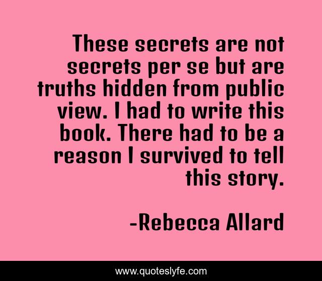 This page presents the quote "These secrets are not secrets per se but are truths hidden from public view. I had to write this book. There had to be a reason I survived to tell this story.". Author of this quote is Rebecca Allard. This quote is about shame, domestic-violence, interracial-marriage, memoir, vulnerability,.