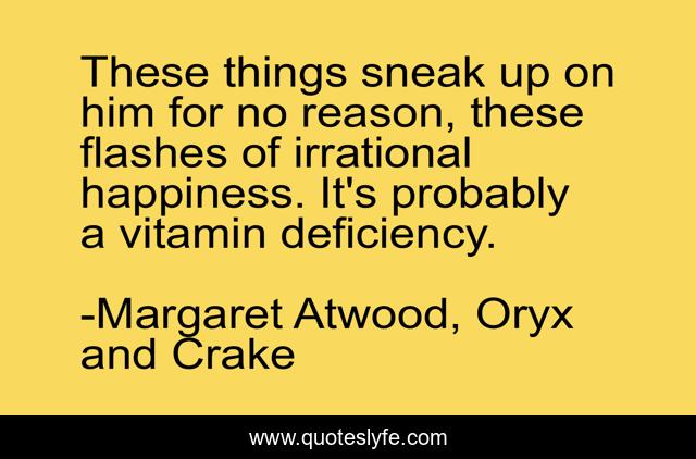 This page presents the quote "These things sneak up on him for no reason, these flashes of irrational happiness. It's probably a vitamin deficiency.". Author of this quote is Margaret Atwood, Oryx and Crake. .