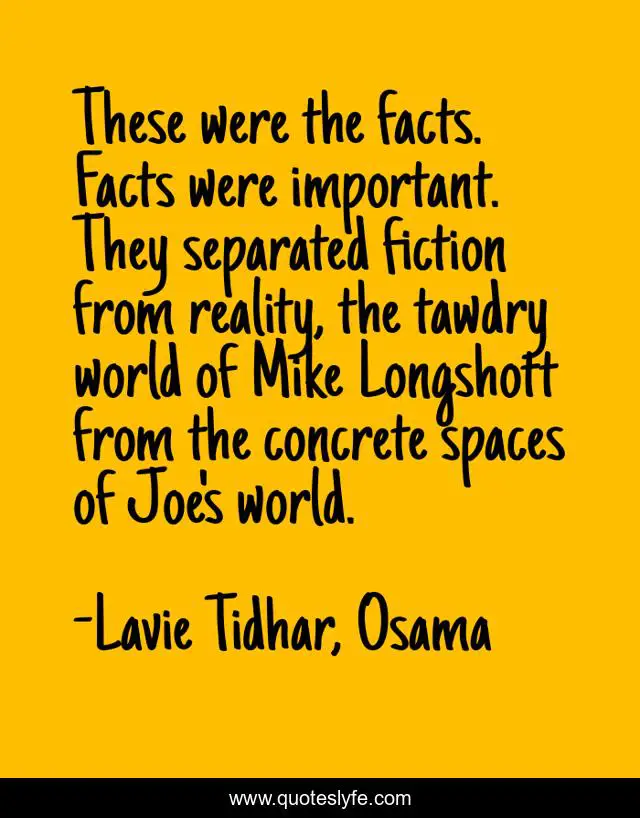 This page presents the quote "These were the facts. Facts were important. They separated fiction from reality, the tawdry world of Mike Longshott from the concrete spaces of Joe's world.". Author of this quote is Lavie Tidhar, Osama. .