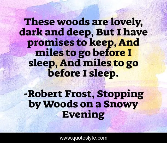 This page presents the quote "These woods are lovely, dark and deep, But I have promises to keep, And miles to go before I sleep, And miles to go before I sleep.". Author of this quote is Robert Frost, Stopping by Woods on a Snowy Evening. .